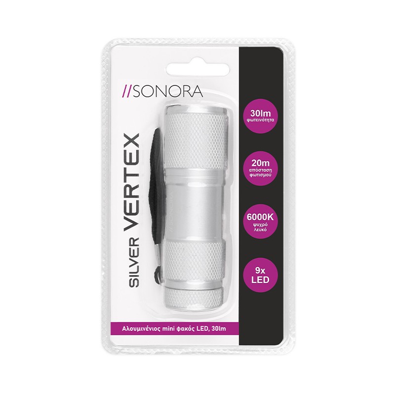 Διαθέτει ανθεκτικό περίβλημα αλουμινίου με 9 LED, με απόδοση φωτεινότητας 30 lumens και εμβέλεια 20m.