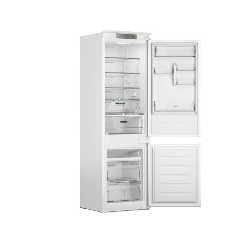 Χαρακτηριστικά αυτού του εντοιχιζόμενου ψυγειοκαταψύκτη Whirlpool: λευκό. Τα γυάλινα ράφια παρέχουν ανθεκτικότητα και κομψότητα. Ένας ανεμιστήρας εξασφαλίζει ομαλή και ομοιόμορφη ροή αέρα σε όλη τη συσκευή για βελτιωμένο αερισμό. Οι αισθητήρες 6th Sense μειώνουν αυτόματα τη θερμοκρασία του ψυγείου όταν προστίθενται νέα είδη, μειώνοντας την κατανάλωση ενέργειας. Ένα πρακτικό ράφι για ασφαλή αποθήκευση μπουκαλιών.